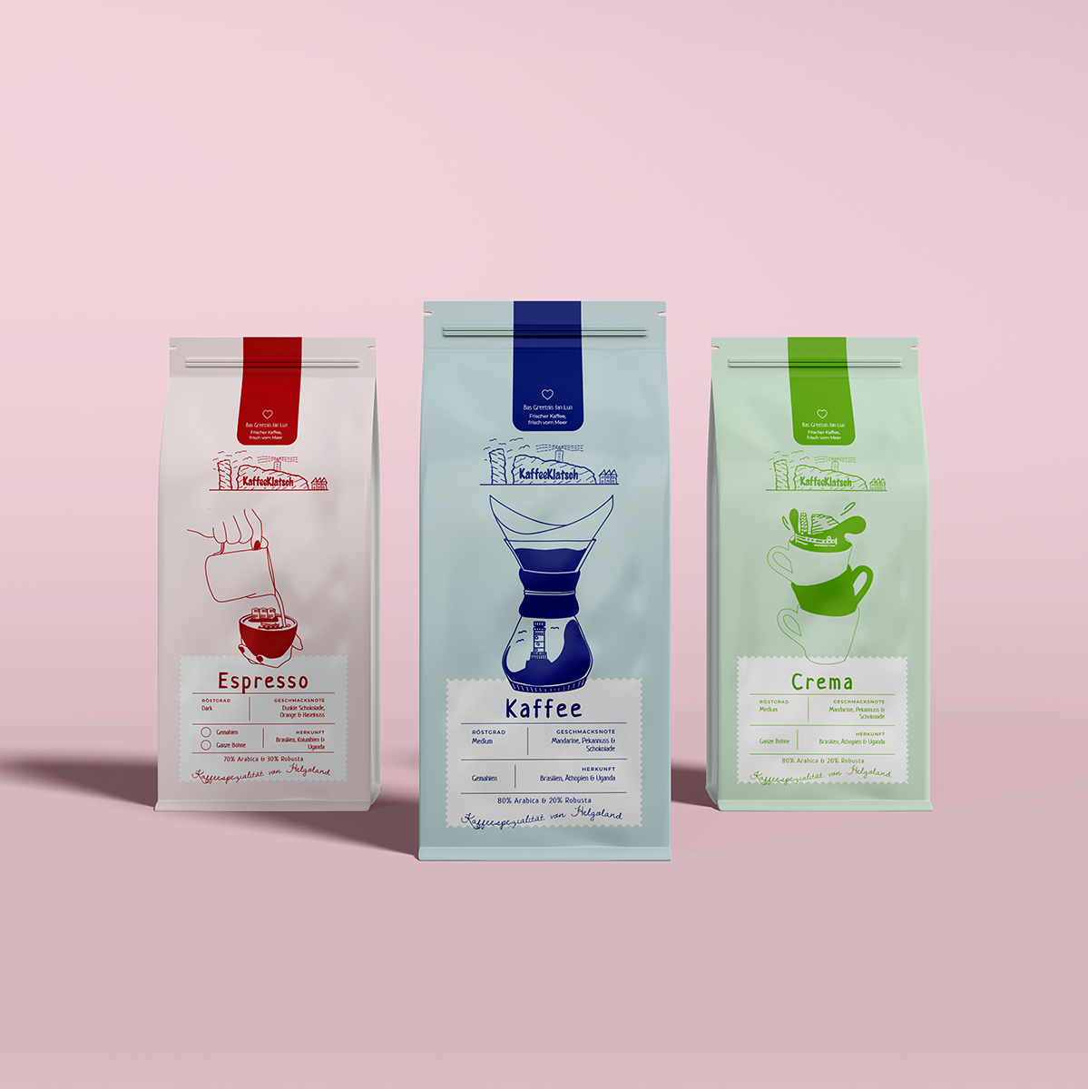 Neuer Look, bewährte Bohne! Unsere Kaffees tragen jetzt maritime Helgoland-Outfits – mit Möwen, Leuchtturm und Börteboot. Der Inhalt bleibt, wie ihr ihn liebt: langsam geröstet, handverlesen und mit viel Inselflair.